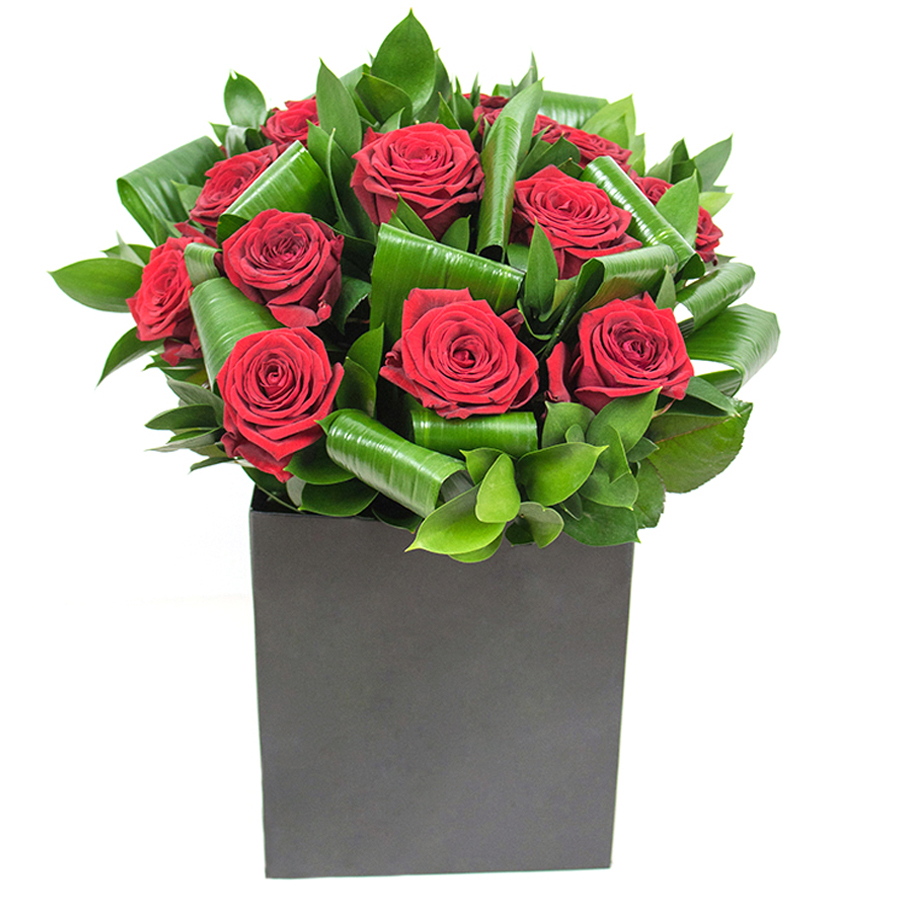 Our elegant red rose display features vibrant red roses paired with aspidistra leaves and ruscus, creating a unique and stylish bouquet. Perfect for adding grace and sophistication to any room.