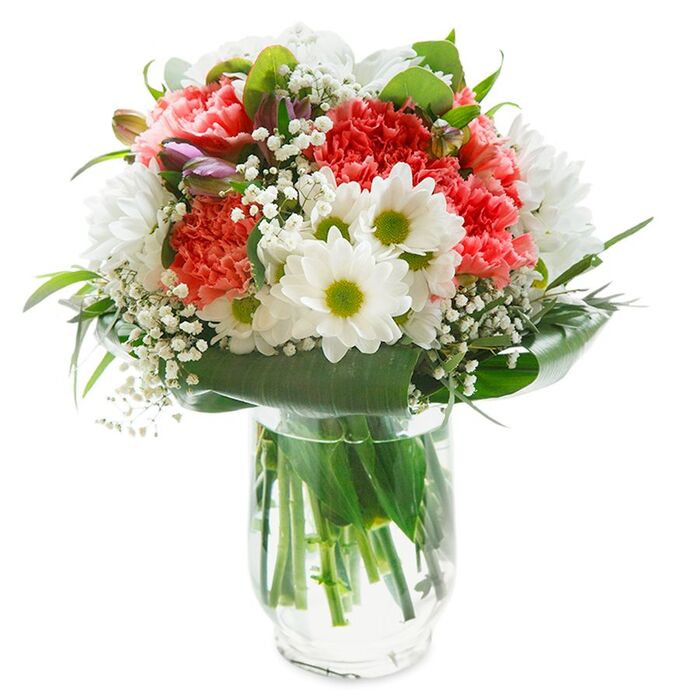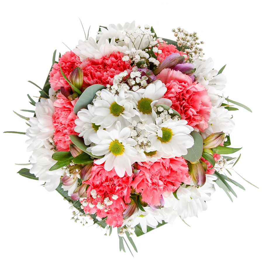 This exquisite arrangement delivers timeless elegance with a modern twist. Our bouquet features pristine white chrysanthemums and airy gypsophila paired with gentle light pink carnations, all gracefully arranged with vibrant aspidistra leaves. Each flower is chosen by our expert florists ensuring optimal freshness and lasting beauty.